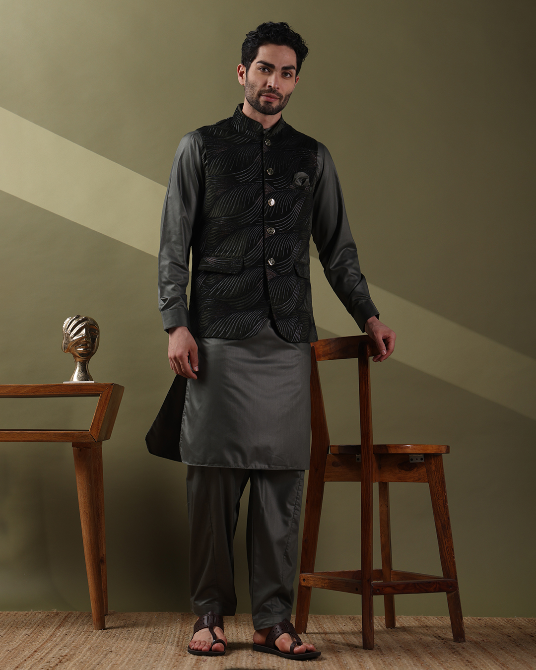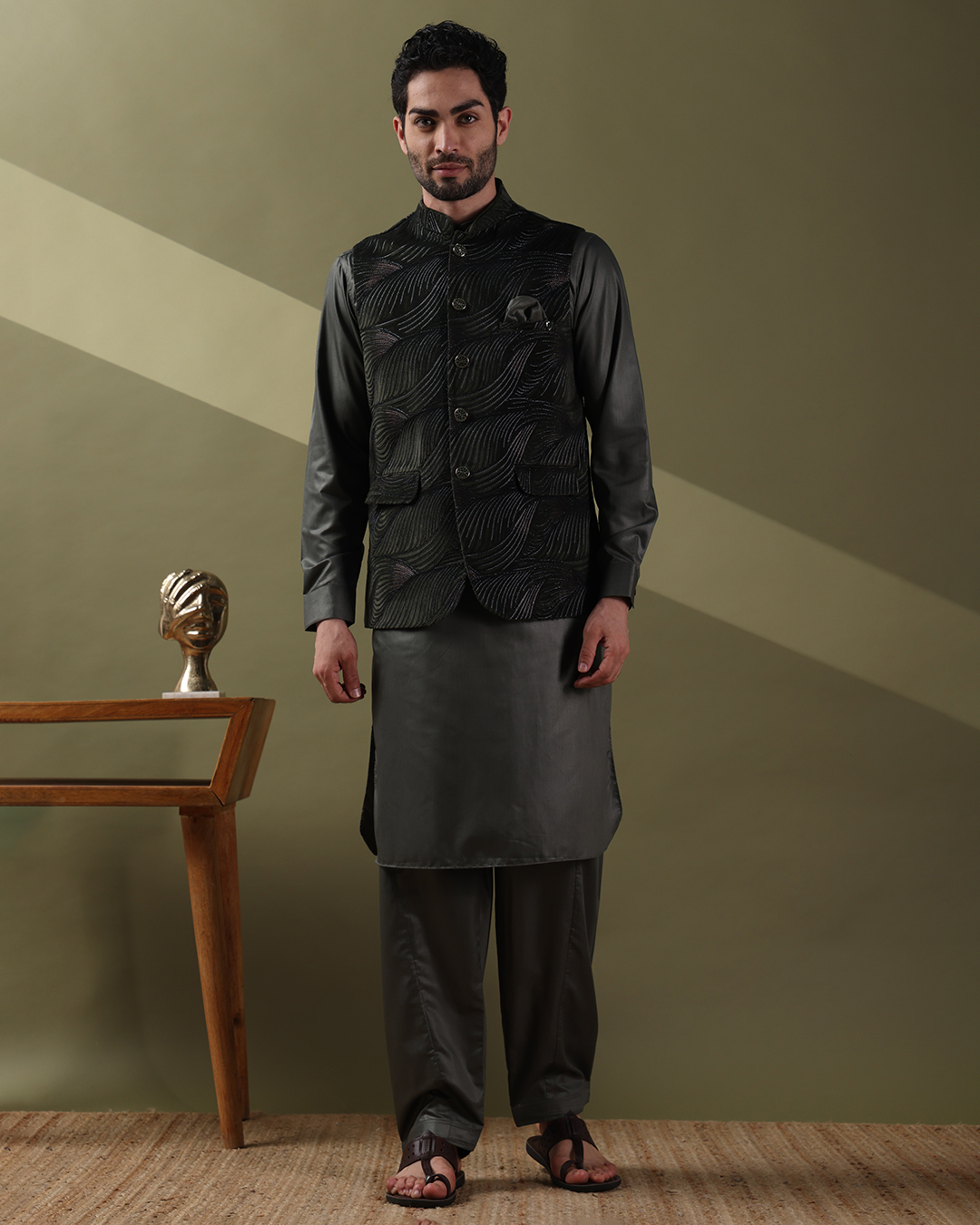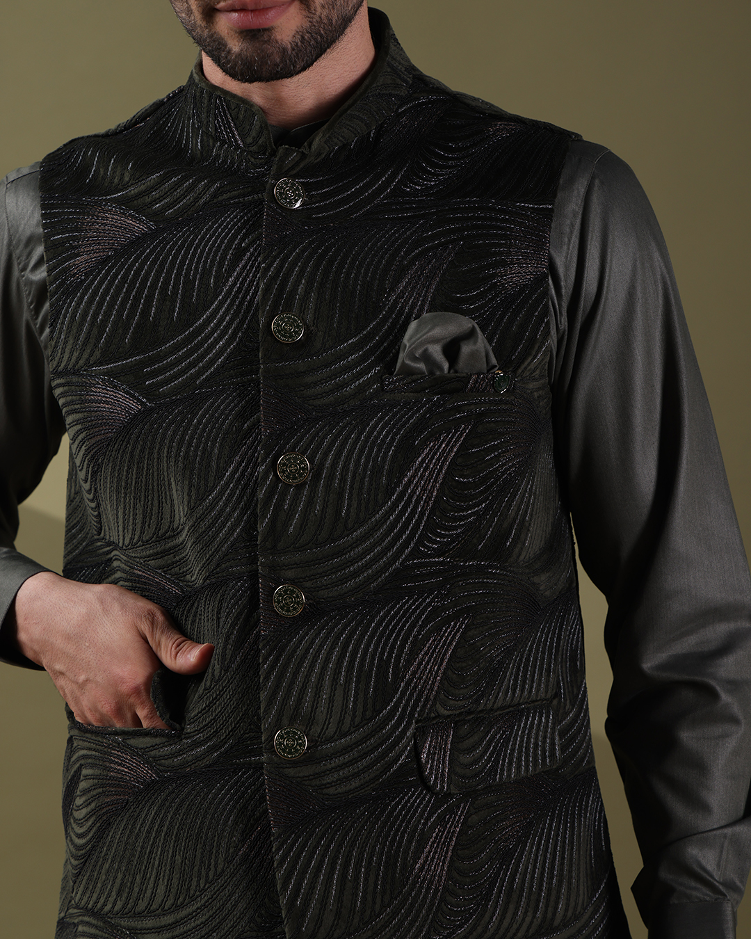 VT7 Olive Kameez Shalwar Waistcoat Set